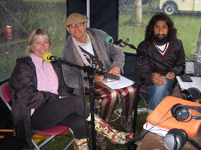 Having said that, we did find time to socialize with the delightful Simon Costin and his brother Anthony, who were exhibiting their travelling Museum of British Folklore – see the pic above with the lovely little caravan. We’ve teamed up with Simon before at the Wessex Folk Festival and it was thanks to him that we were invited to Port Eliot. He also interviewed me on Sunday, in the pouring rain, for the Port Eliot Radio Show which will go out on podcast too. You can see us above well wrapped up against the elements with the producer – Hamid I think although I’m terrible with names. Simon is a huge Stonewylde fan and we both really enjoyed doing the radio interview.