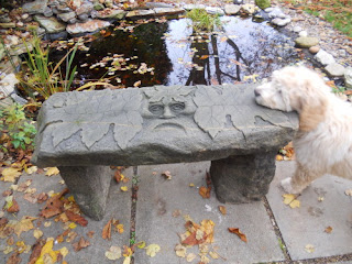 It’s actually so beautiful that I’m now thinking maybe I won’t use it as a bench after all. And I don’t really want to sit on his face, which seems a little disrespectful! So perhaps I shall use it more as an altar to nature. I have a fire-basin that my children bought me last year, and with the water in the pond and my wind-chimes too, I think the area will become my Place of the Elements. I often sit here and watch the birds and squirrels, the sky and clouds, and feel the trees’ presence all around me.The bench will make a lovely focal point and will represent Earth. Can you see the seam in the piece of stone? And it’s slightly glittery too.