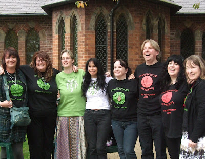 An amazing line-up of Stonewylde fans showing all four T-shirts at Gorton Monastery