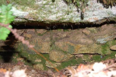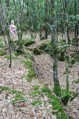 The woodland was overgrown with very little sign of any human activity at all. Then we noticed some more stones, went to look more closely, and almost fell into a pit of dead leaves. It was a long thin pit – and something clicked! Could it be another sunken dolmen???? We started to examine the sides of the pit, and were both struck by a great bolt of excitement and delight – the sides weren’t made of earth but of stone! Much of it was covered with moss, but if you scraped this off a bit you hit stone – and some in the same dry-stone style as the dolmen at Carnac (and the long barrow at West Kennet for that matter).