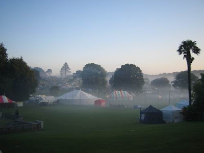 Above are the before and after photos. The gothy one is me on Friday night before bedtime (mattress-time?), near the campsite. Please note the necklace which I shall tell you more about another time. The beautiful one of the empty grounds swathed in morning mist is after the sleepless night.