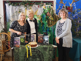 Lyn had organised the whole event so well, and after teaching two classes, it was time to officially open the library. The local press were there and some of the younger children had dressed up as Villagers from Stonewylde, and served everyone with hot cross buns. And the Green Man himself turned up – it was amazing!